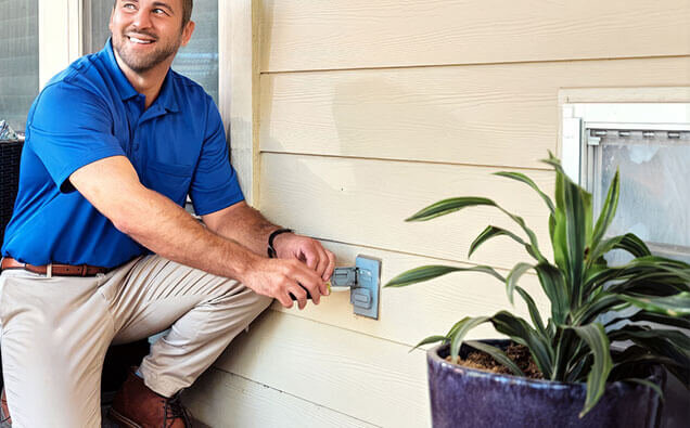 Weatherproof power outlet installation for backyards, patios, pool areas and garden sheds with IP-rated protection for external use.
